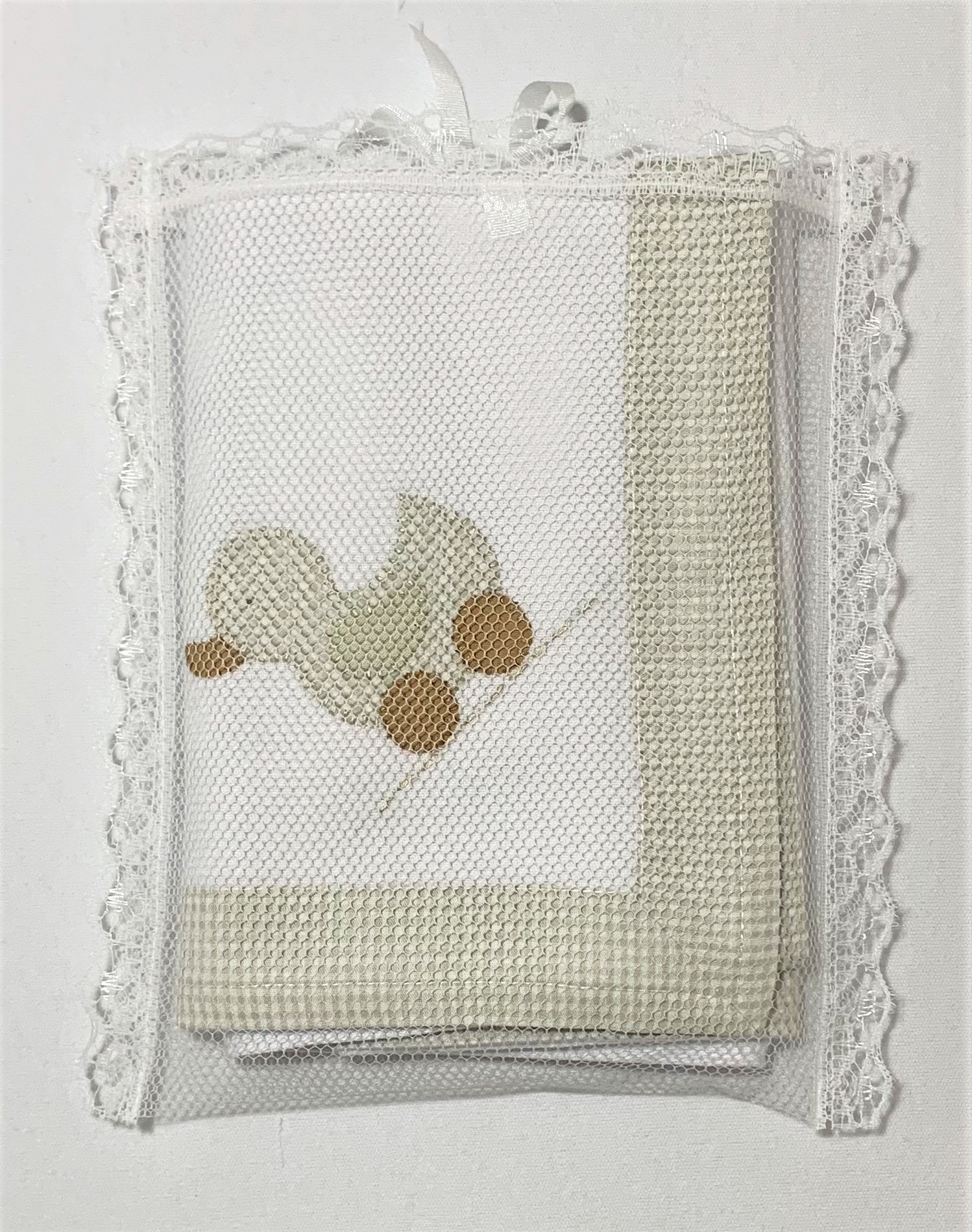 O Cueiro de Flanela Brinquedo Bege tem o bordado à mão com desenho do pato e detalhes bege. As bordas são de tecido xadrez bege. 100% algodão.