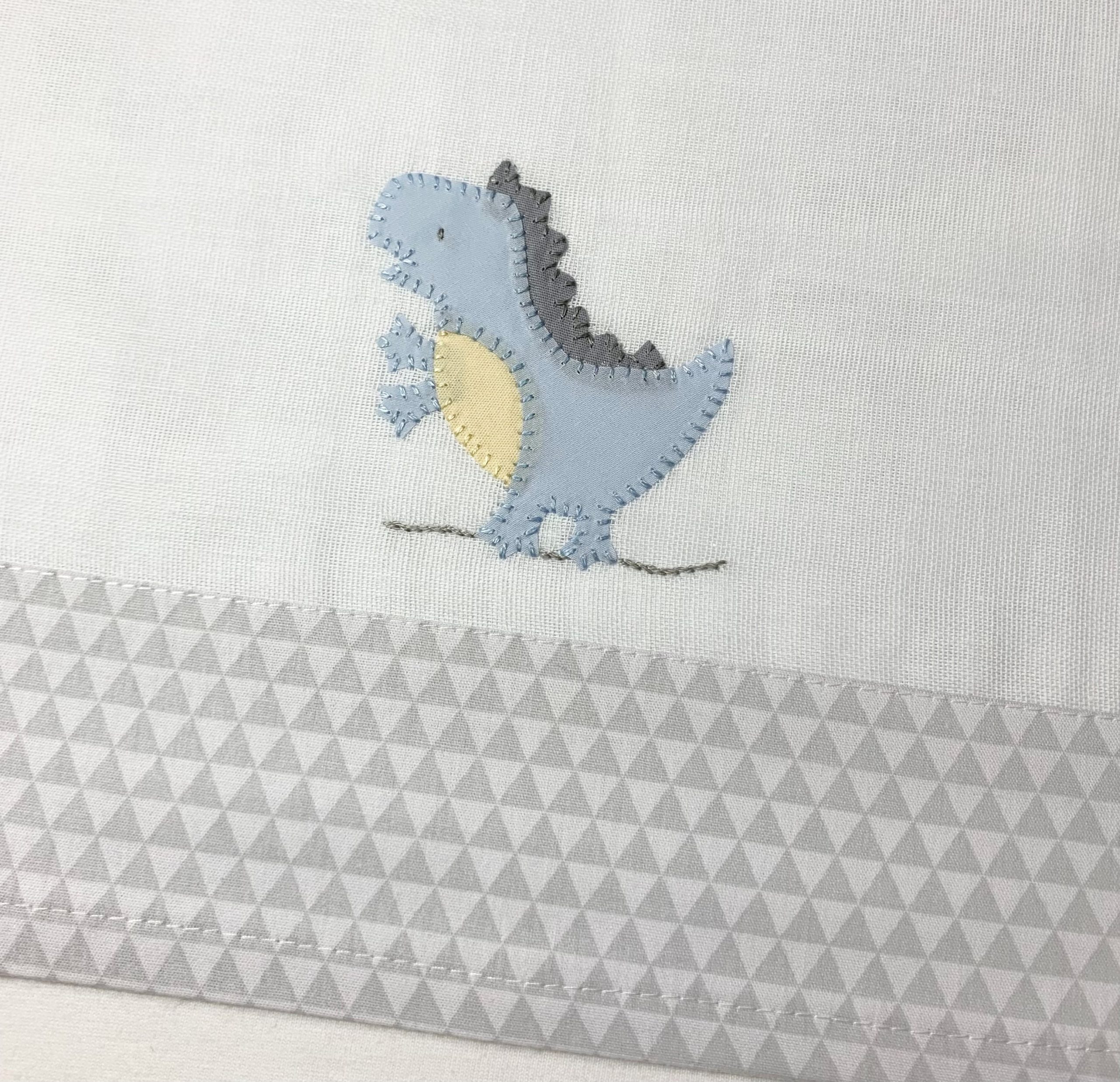 A Fralda de Apoio Dino tem o bordado à mão com desenho do dinossauro azul. 100% algodão, tem barra de tecido tricoline cinza e branco triângulos.