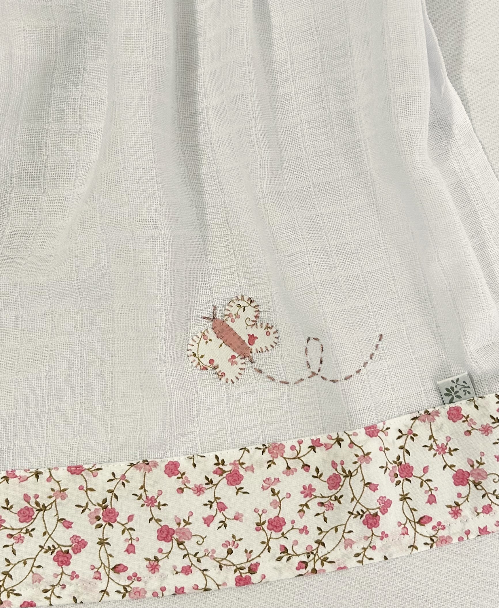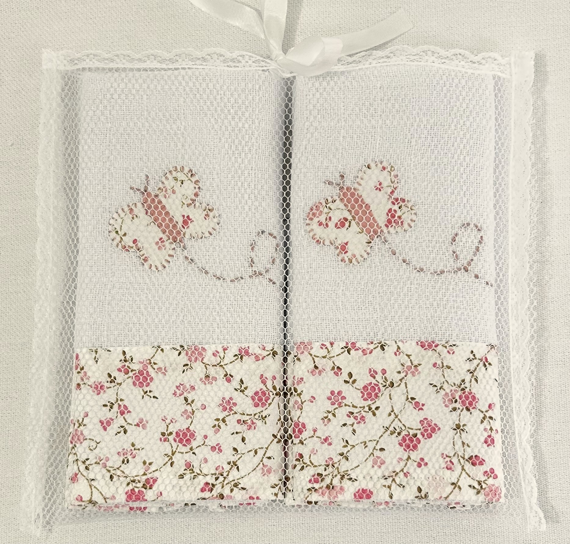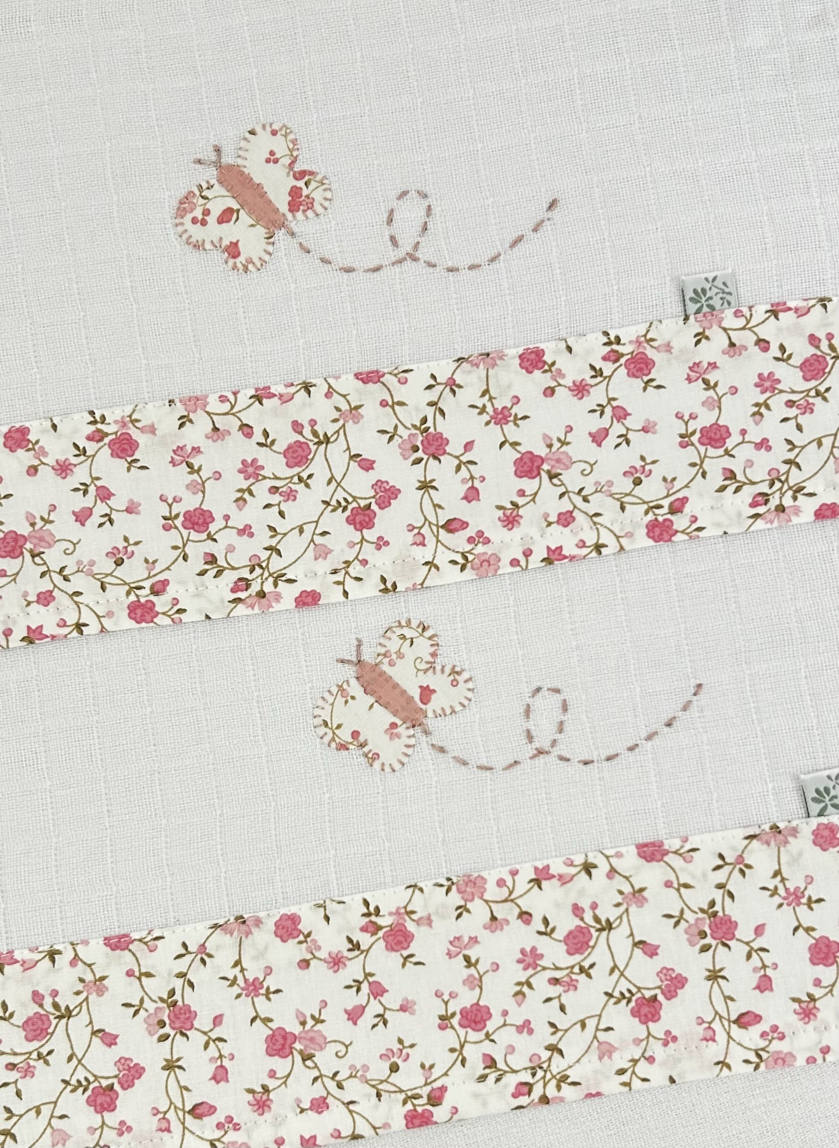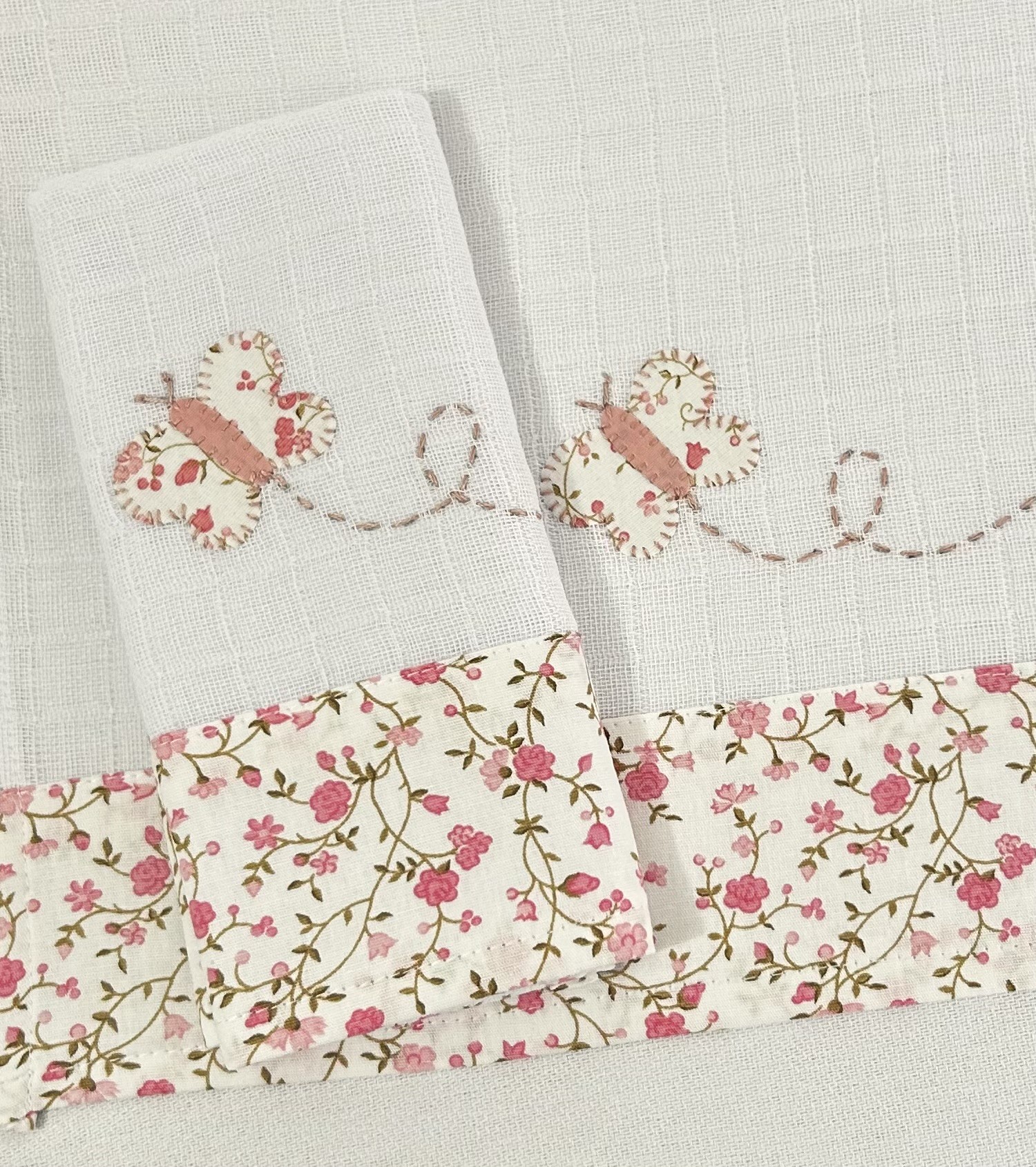Kit com duas fraldas de ombro bordadas à mão. cada frada com uma borboleta. Feitas totalmente em algodão, têm barra de tecido estampado com as florezinhas rosê e bege.