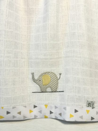 As Fraldinhas de Boca Elefante Amarelo e Cinza vem com 3 peças, tem o bordado à mão e barra de tecido tricoline triângulos amarelo e cinza, uma tem bordado de elefante cinza poá, uma com elefante amarelo e uma com elefante xadrez bege. 100% algodão.