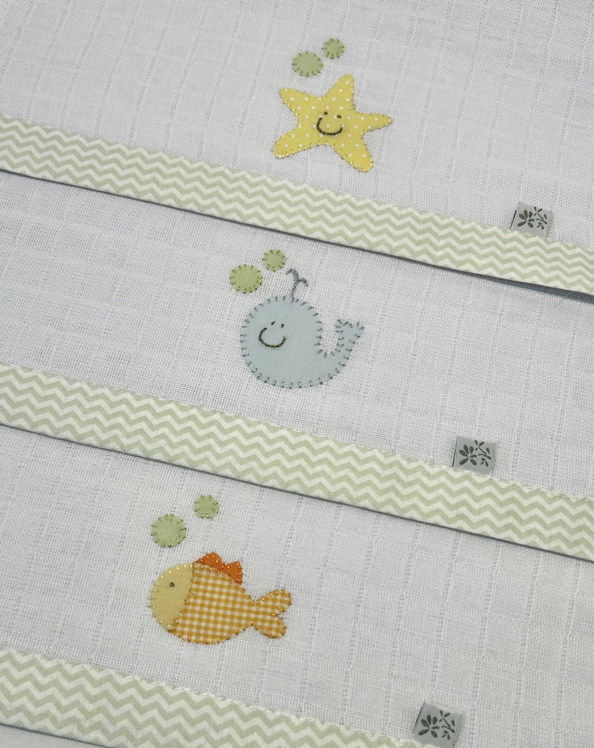 As Fraldinhas de Fundo do Mar vem com 3 peças, tem o bordado à mão e barra de tecido tricoline chevron verde, uma tem bordado de baleia, uma com estrelado mar e uma com peixe. 100% algodão.