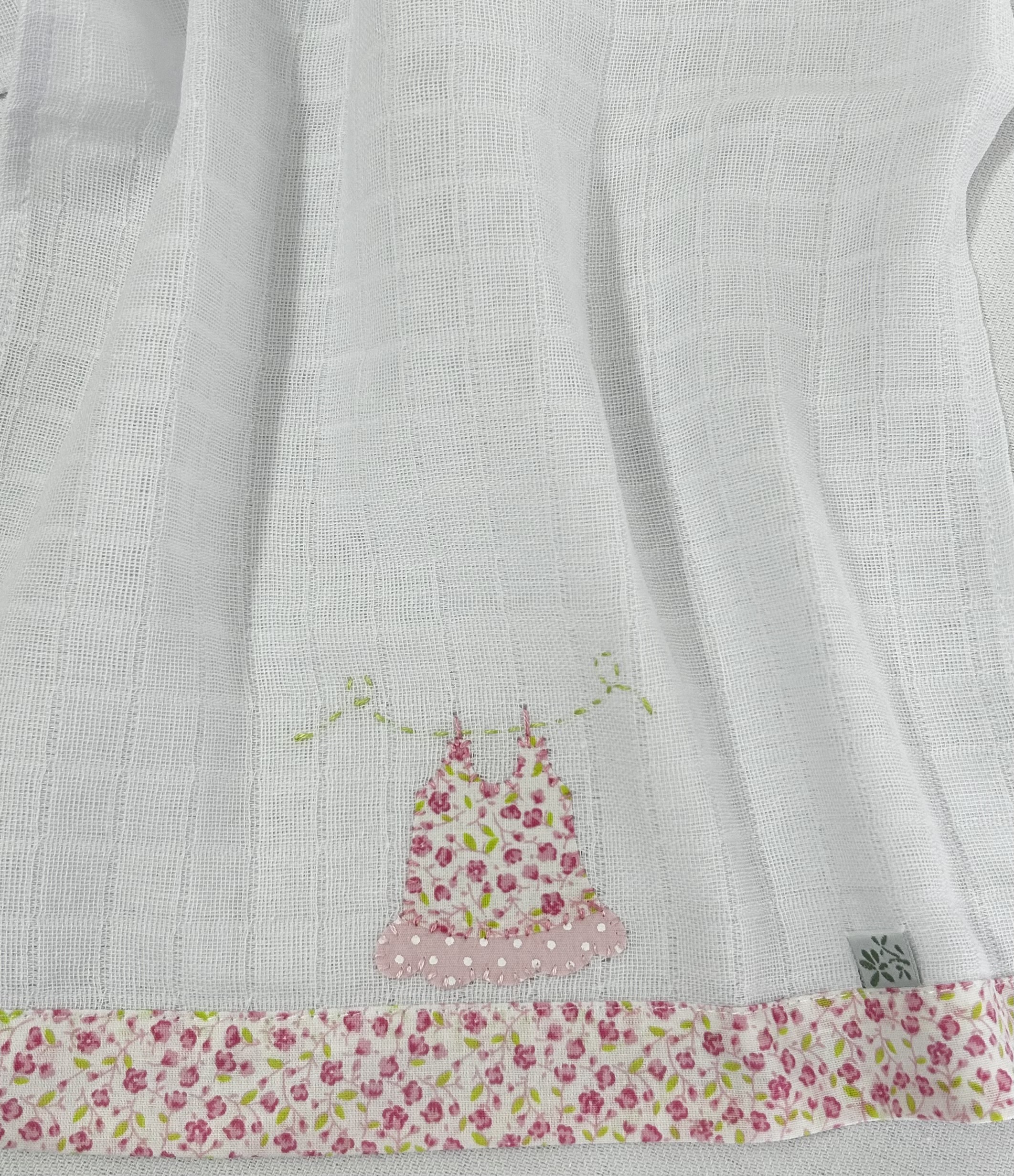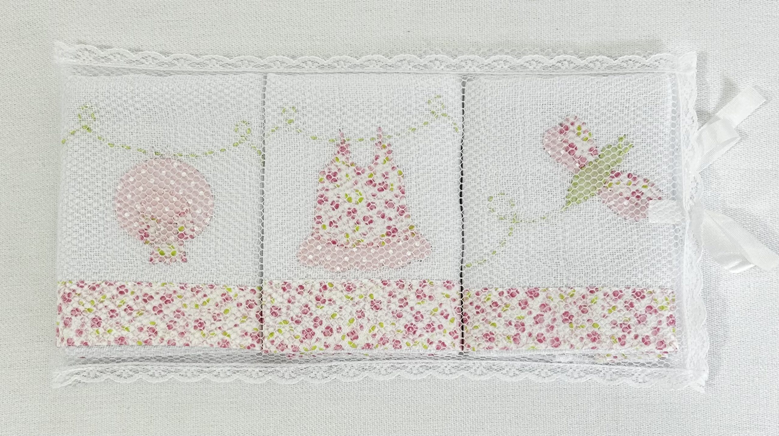 As Fraldinhas de Boca Roupinha no varal vem com 3 peças, tem o bordado à mão e barra de tecido tricoline floral, uma tem bordado de vestido, uma com libélula e uma com chapéu. 100% algodão.
