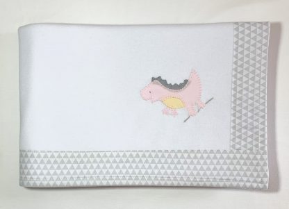 A Manta de Malha Dina tem o bordado à mão com desenho do Dinossauro rosa. Possui a barra de tecido tricoline cinza e branco triângulos. Feita com malha dupla Suedine, 100% algodão.
