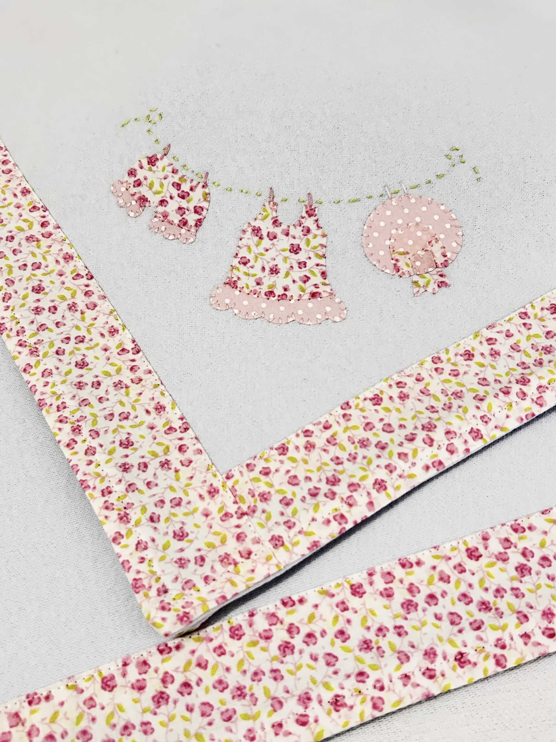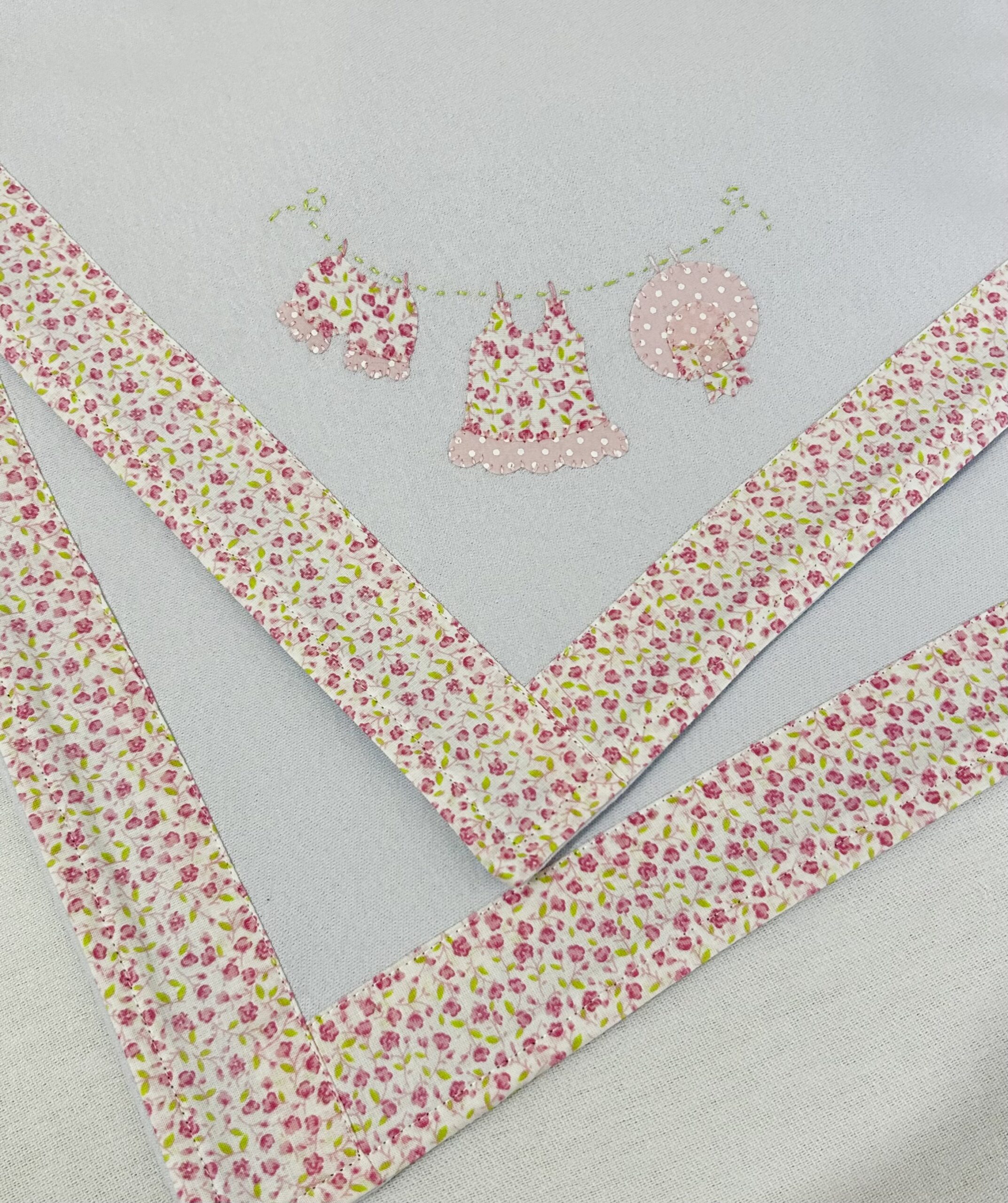 A Manta de Malha tem o bordado à mão com as Roupinhas penduradas no Varal e detalhes cor de rosa. Feita com malha dupla suedine, 100% algodão. Tem barra de tecido tricoline estampado floral nos 4 lados.