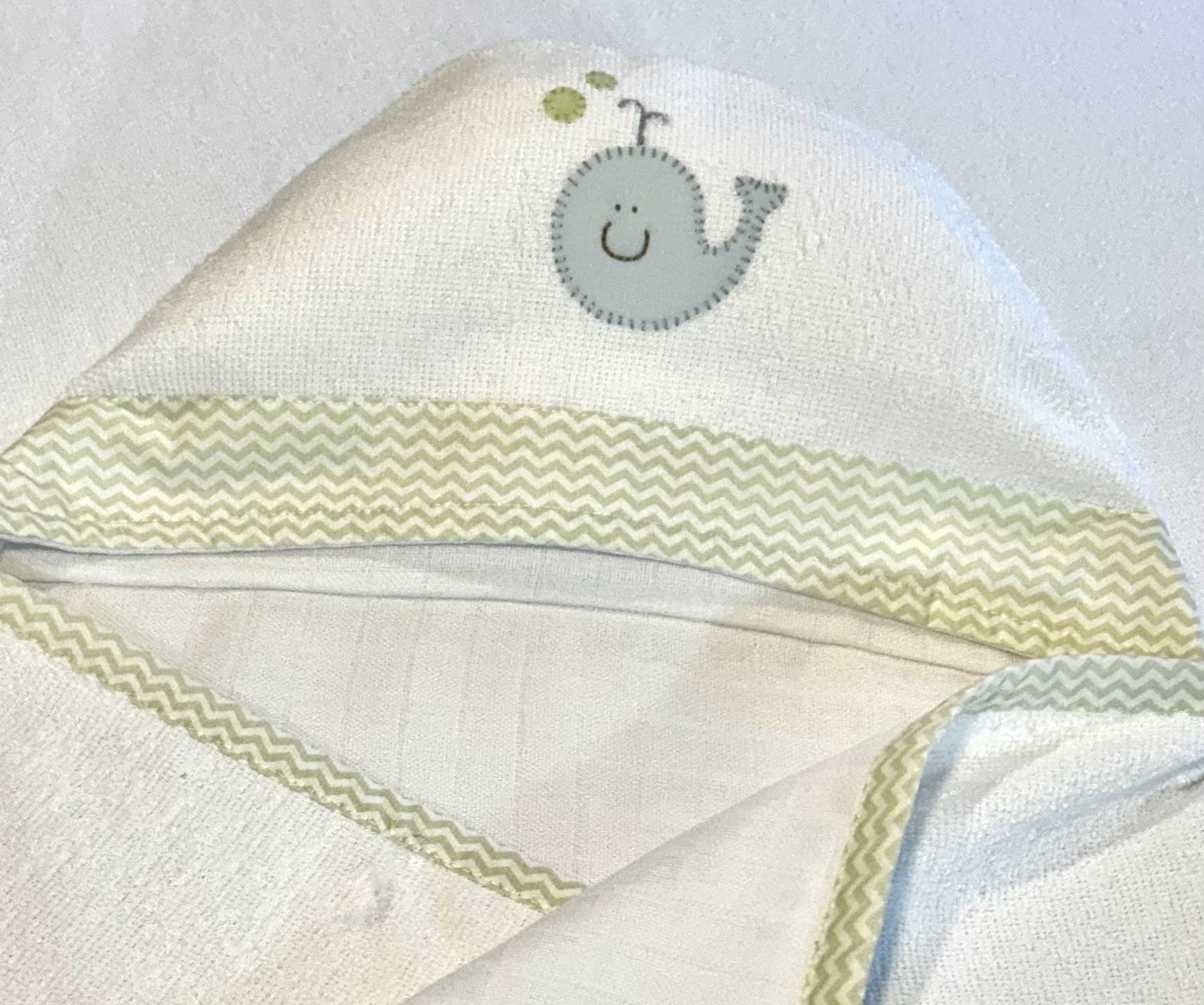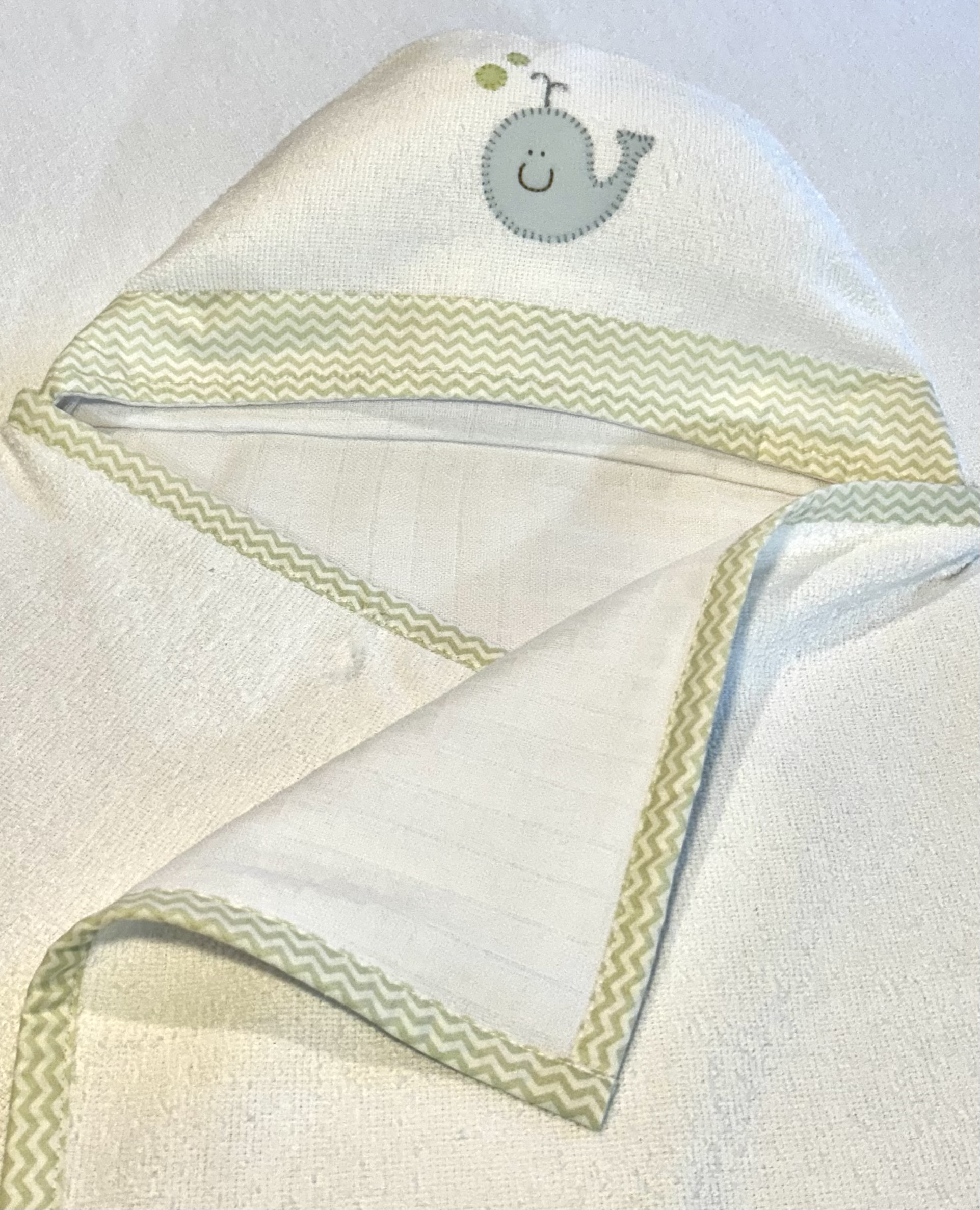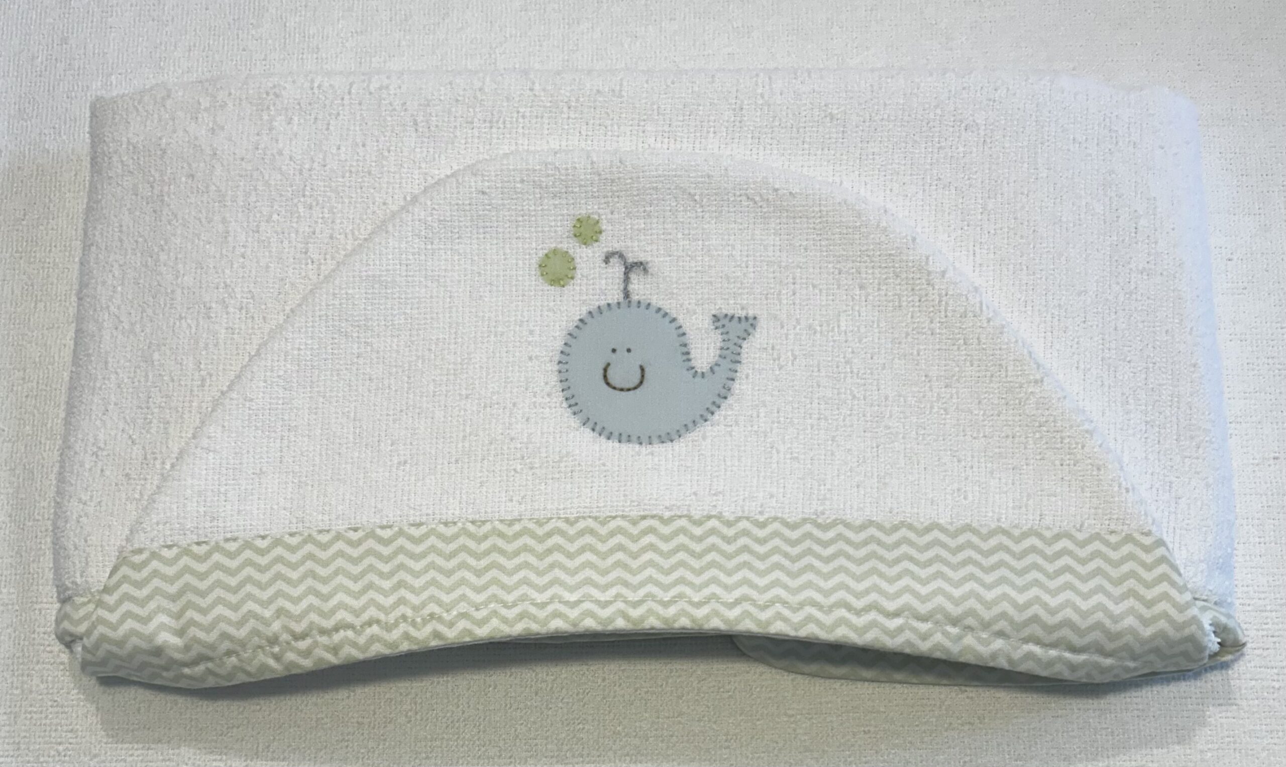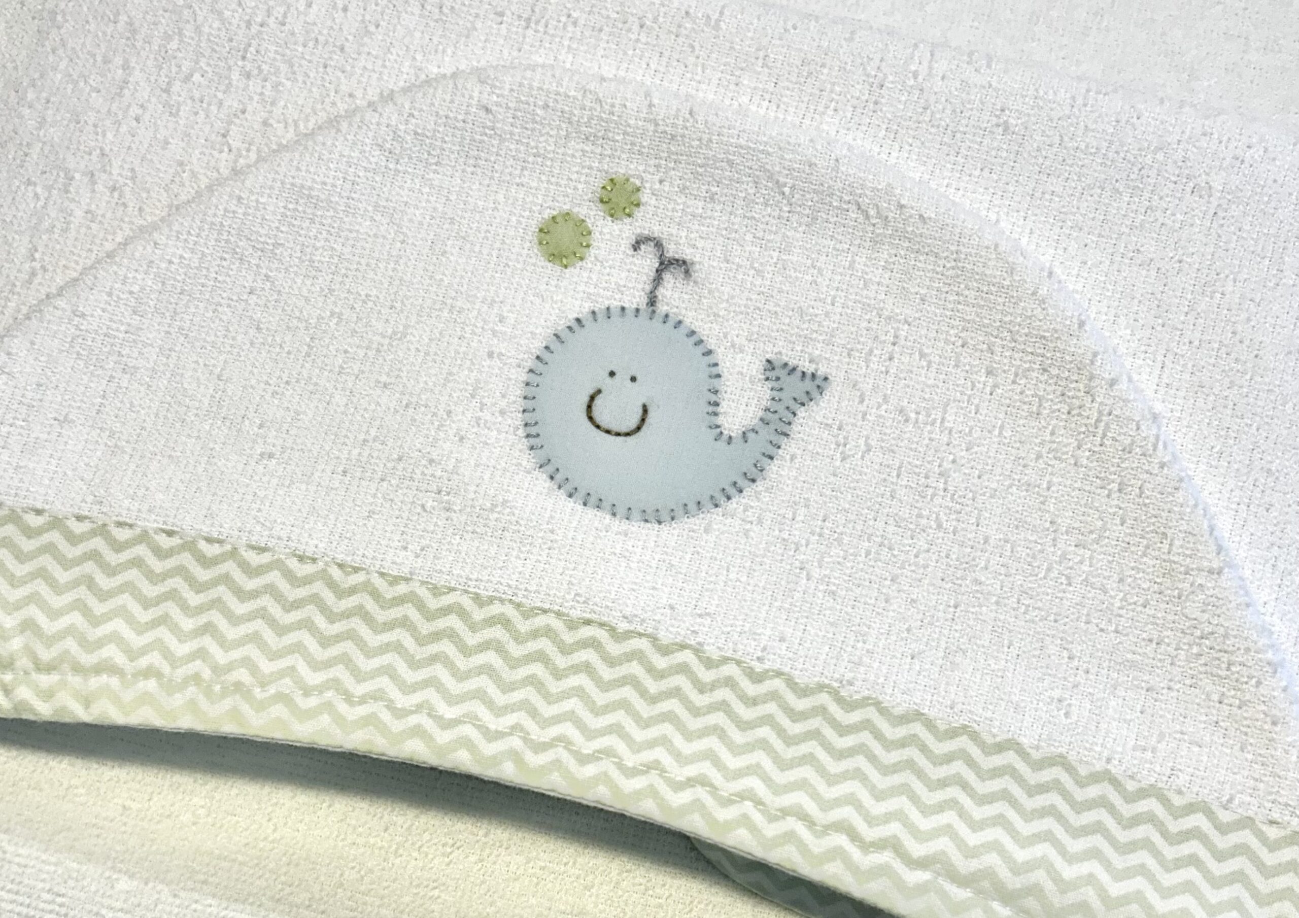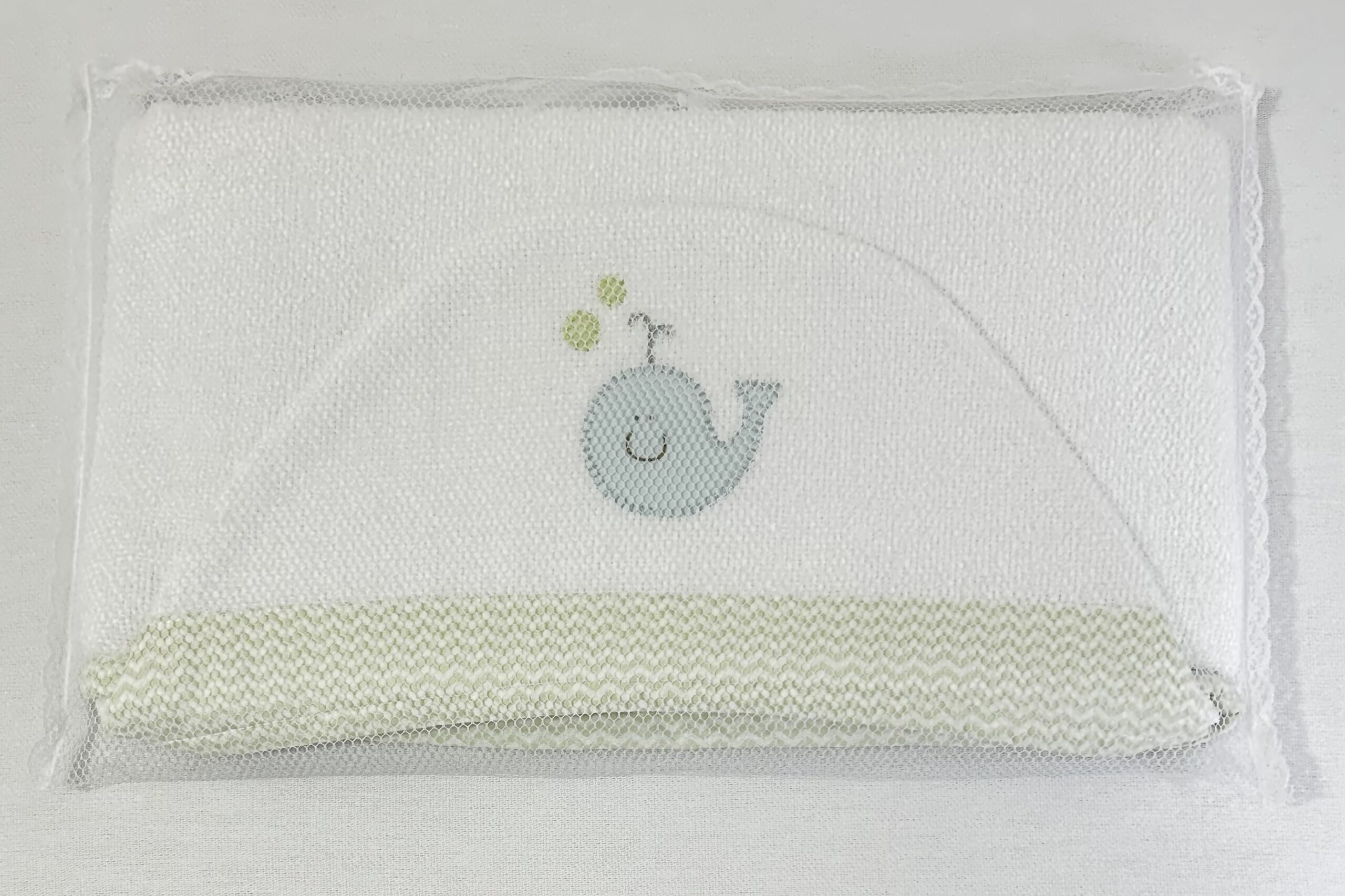 A Toalha de Capuz é feita em atoalhado forrada com fralda, 100% algodão, tem o capuz bordado à mão com o desenho da baleia com barra e acabamento por toda a volta em tecido tricoline chevron verde.